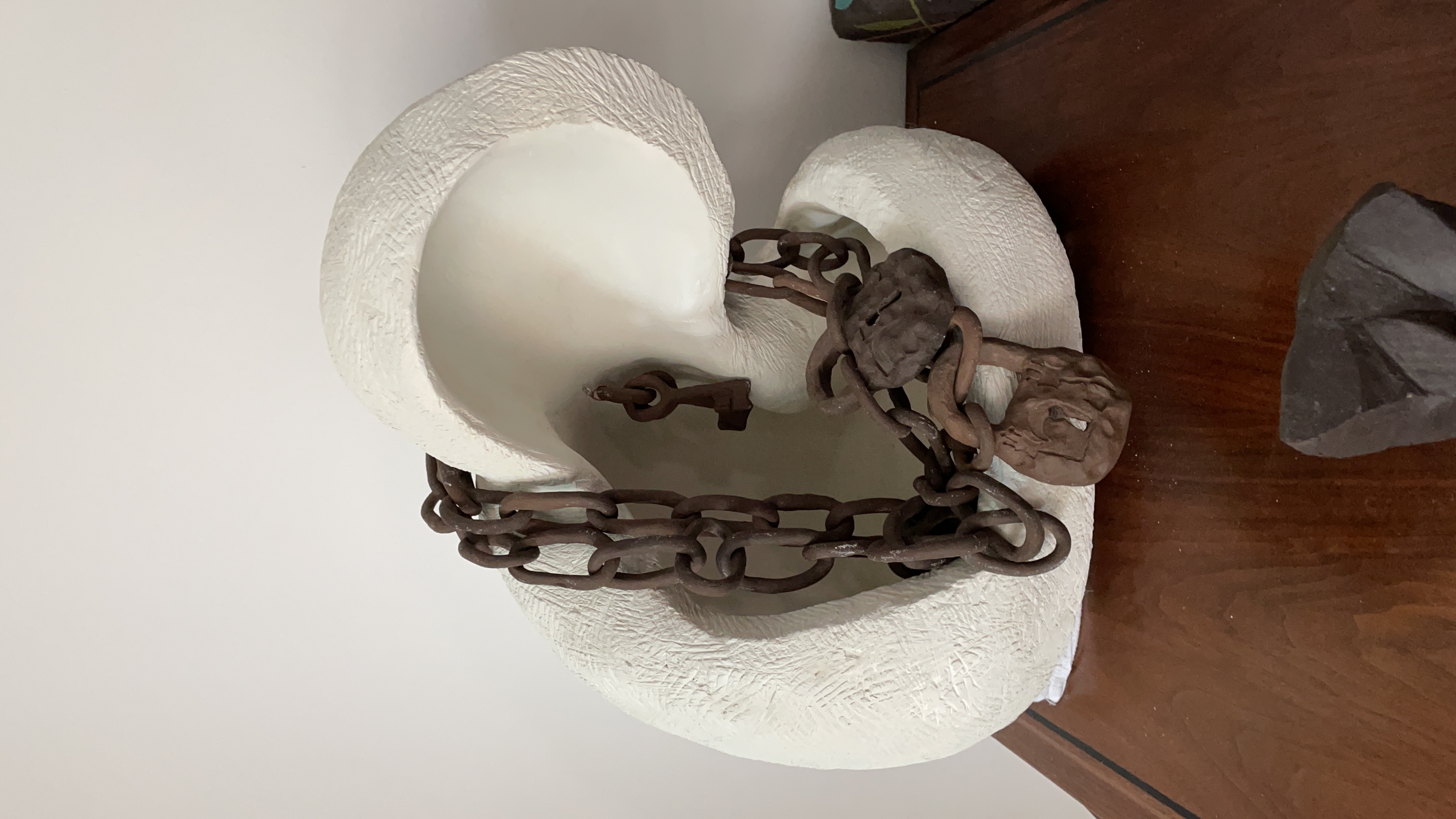 Hostage is a study of the intrusion and authority of Jewish religious patriarchy over women's bodies. The artist probes the tendency of the rabbinic patriarchy to view women as breeders subject to male control, specifically focusing on the Rabbinic push to make sure the wombs birthing children to Jewish men, are married or converted according to the most stringent Halakha. This piece questions who actually holds the power. The presence of the keys inside implies that it is in the women's hands, should we choose to exercise it.