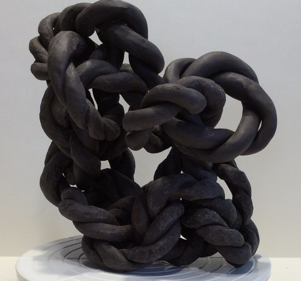 Wedding Rings is a dynamic sculpture made of 16 intertwined twisted rings. Sixteen is the number of the different prototypical women mentioned in the Torah portion of Ki Tetze, found in the book of Deuteronomy, beginning with the woman captured in war who is of interest to one of the captors and the rules governing his ability to take her for a wife, and ending with the wife who saves her husband in a fight by grabbing his adversary's genitals, and is punished by having her hands cut off.